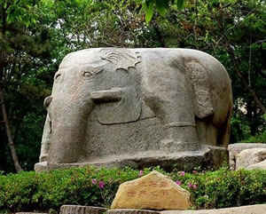 從龍洞西行,在林木掩映的山坡上.屹立著一座碩大的漢代圓雕石象。石象依一塊花崗巖巨石的自然形狀雕刻而成雕刻而成,象身高2.6米,長4.8米,背寬3.5米,石像耳闊體肥,四肢健壯,長鼻巨牙、卷尾粗足,形態(tài)雄奇,豐滿肥碩。象身西側(cè)有一高0.88米,寬0.49米,深0.2厘米的陰鑿凹面,系未見刻銘的題榜,象身東側(cè)以陰線刻一高1.13米,寬0.62米的方框,內(nèi)刻隸書“象石”字樣,在刻銘與象前腿之間,還鑿刻了一個頭梳“丁”字形發(fā)髻,手持勾鞭,腳帶鐐銬高0.92米的馴象奴。象的四足均踏著蓮花,體現(xiàn)了佛教中六牙白象王在水中步步蓮花的故事傳說。它是孔望山漢代佛教造像有機(jī)整體中不可分割的一部分。此石系目前我國發(fā)現(xiàn)的東漢時期最大的圓雕石刻,石象南側(cè)約一百五十米處,還有與此同時期的石雕鎮(zhèn)海蛙,此蛙為當(dāng)時鎮(zhèn)海之物。體長240厘米,寬220厘米,通高110厘米,石蛙頭部略損,前兩肢半殘,眼睛陰刻,背上遍刻陰線鱗紋。這兩座石雕,別特是石象,氣勢雄偉,造型精美。均為我國珍貴的石刻藝術(shù)珍品。