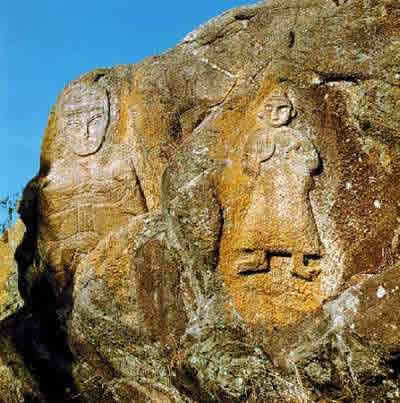 孔望山摩崖石刻造像群位于孔望山南麓西端的斷崖上,分布在東西長 18米,上下高約8米的范圍內(nèi)。造像群像有三種:浮雕造像、小龕內(nèi)的線刻畫像和附屬于浮雕造像的臺座和燈碗。浮雕造像共有89尊,其中道教的漢裝人物像4尊,分別為老子及其供養(yǎng)人、關(guān)令尹喜和黃帝。屬佛教人物造像共85尊,主要為佛經(jīng)變故事,核心是位于造像中央偏下部的“涅盤圖”,共由46尊人物圖像組成,中心人物是高浮雕的釋迦牟尼仰身臥像。