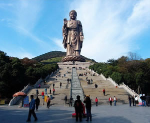 矗立在小靈山南麓的靈山大佛,包括蓮花座在內(nèi)通高為八十八米,相當于一幢三十馀層樓房的高度,比“山是一尊佛,佛是一座山”的四川樂山大佛還要高出十七米,是迄今為止我國最高的巨型佛像。如果加上三層座基,總