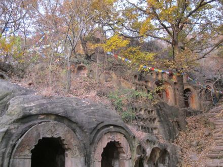 傳說,棲霞寺創(chuàng)建人僧紹曾夢見西巖壁上有如來佛光,于是立志在此鑿造佛像;他病故后,其子在南齊永明二年(484年)開始與僧智度禪師在西壁上鑿佛龕,直到南朝齊永明七年(489年),三圣像才得以完成,三佛合稱“西方三圣”,該殿也稱“三圣殿”。南朝梁大同六年(540年)三圣像佛龕上出現(xiàn)佛光,驚動齊梁貴族,于是紛紛前來鑿石造像。于是從南朝齊永明二年至梁天監(jiān)十年(484-511年)逐漸開鑿而成的佛像始有515尊,所有佛像或五六尊一龕,或七八尊一室,分鑿于294個佛龕中。后來,唐、宋、元、明各代相繼在紗帽峰都有開鑿,連南朝在內(nèi),共有700尊。佛像大者高數(shù)丈,小者僅盈尺,號稱千佛崖。 |