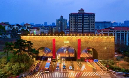 太平門位于玄武湖東南角,是南京明城墻十三座明代京城城門之一,是明朝京師應天府京城的正北門,城門東側(cè)城墻被稱為“龍脖子”。復建后的太平門為方便交通改為三孔城門,主門洞設四股車道,兩個輔門洞各設兩股,城門寬約72米。