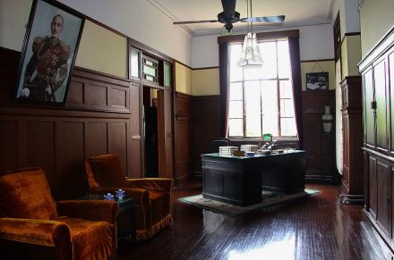 總統(tǒng)辦公室位于總統(tǒng)辦公樓(子超樓)二層的東南角,是一個(gè)由三個(gè)房間組成的套房,曾是蔣介石的辦公室。中間的一間為辦公室,臨窗有一巨形寫(xiě)字臺(tái),寫(xiě)字臺(tái)上有一本臺(tái)歷,臺(tái)歷的日期仍然是1949年4月23日,這天是南京的解放日,歷史在這里定格。一張?zhí)刂频钠まD(zhuǎn)椅,會(huì)客用的沙發(fā)上方懸掛著蔣介石身穿戎裝的巨幅照片,四周的墻壁上則是嵌入墻體的文件柜,屋頂上懸掛著從法國(guó)里昂進(jìn)口的磨砂玻璃吊燈。辦公室東間為休息室,配有衛(wèi)生間。西間為書(shū)房和接待室。