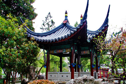 方勝亭,俗稱(chēng)"鴛鴦亭",是民國(guó)前江南惟一的方勝亭。方勝,又稱(chēng)雙菱,指兩菱形相疊。亭基方勝,上為雙頂、遠(yuǎn)觀似雙亭并立,近看卻一亭獨(dú)佇,小巧玲瓏,頗為別致。飛檐翹角,如欲飛的鴛鴦。梁柱間有很大的彩繪"雀替木",這是清代建筑的特征之一。因其少用斗拱,為出挑檐,只得加大這種斜角支撐物。亭里可見(jiàn)一些龍鳳獅虎等動(dòng)物形狀的刻繪。