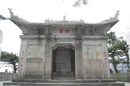 御碑亭位于廬山仙人洞一側(cè)的白鹿升仙臺(tái)上,是明朝皇帝朱元璋所建造的。明朝洪武二十六年九月(1393年)朱元璋為了紀(jì)念周顛仙等人就在這臺(tái)上建起了御碑亭。亭中至今還保存著朱元璋的御碑。碑上刻著這位朱皇帝親自撰寫的《周顛仙人傳》和《四仙詩(shī)》。這塊御碑高約4米、寬1.3米、厚0.23米。