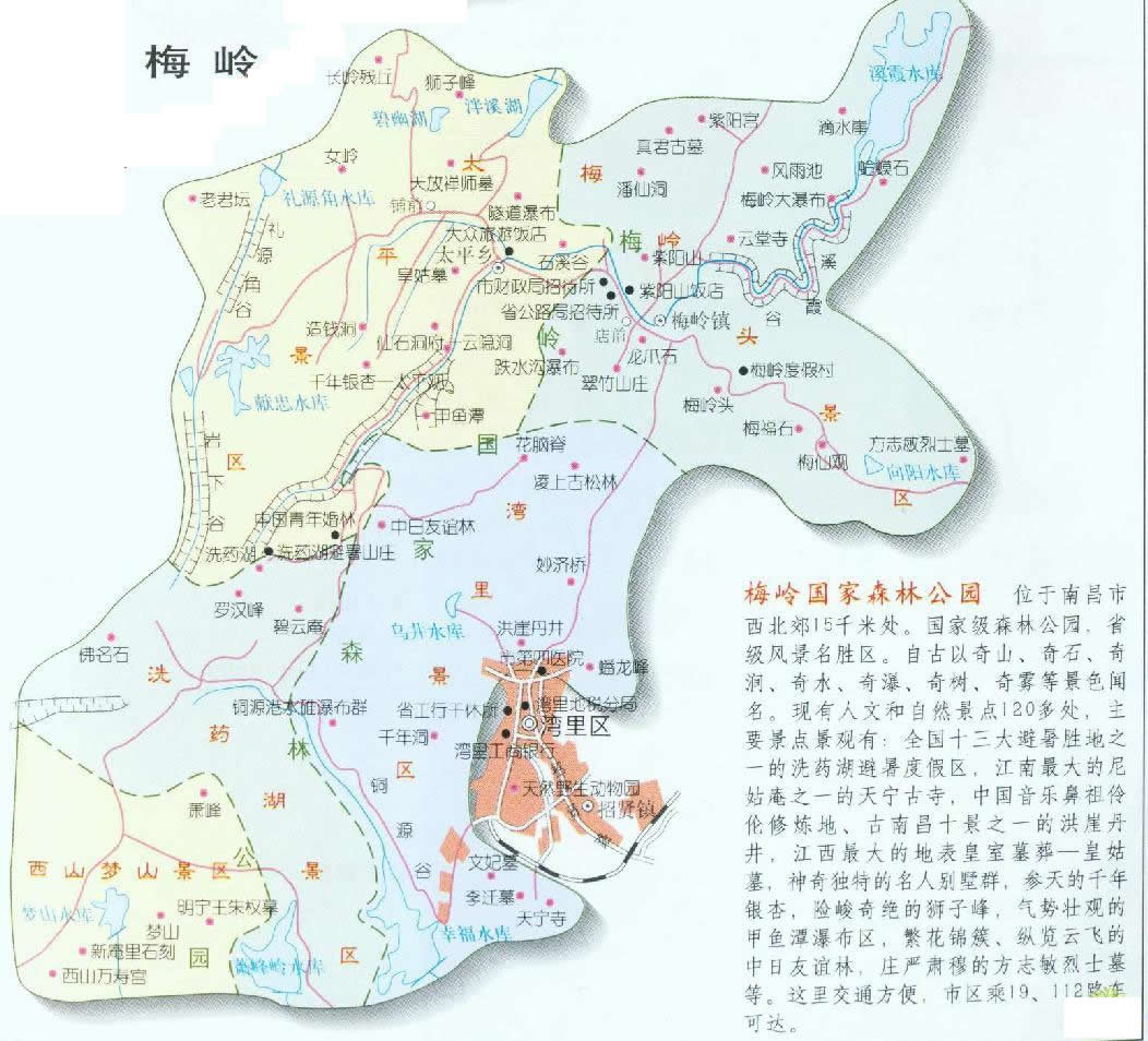 梅嶺有自然和人文景點(diǎn) 120多處,主要景觀有:被稱為全國第十三大避暑勝地之一的洗藥湖避暑度假區(qū)、江南最大尼姑庵之一的天寧古寺、中國音樂鼻祖伶?zhèn)愋逕挼、古南昌十景之一的洪崖丹井、江西最大的地表皇室墓葬──皇姑墓、神奇?dú)特的名人別墅群、參天的千年銀杏、峻險(xiǎn)奇絕的獅子峰、氣勢(shì)壯觀的腳魚潭瀑布區(qū)、繁花錦簇、縱覽云飛的中日友誼林、莊嚴(yán)肅穆的方志敏烈士墓等。