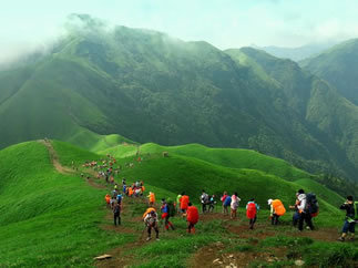 武功山的高山草甸海拔之高,面積之廣在世界同緯度名山中都是絕無僅有的。10萬畝草甸綿綿于海拔1600多米的高山之巔,穿云入霧,春夏綠油油,秋季金燦燦,冬天白皚皚,游人無需遠(yuǎn)赴邊陲,便可領(lǐng)略北國(guó)風(fēng)光,真可謂“天上草原、人間仙境、北國(guó)風(fēng)光、綠色家園”,被專家稱為“奇山伴草甸,天下一絕”。