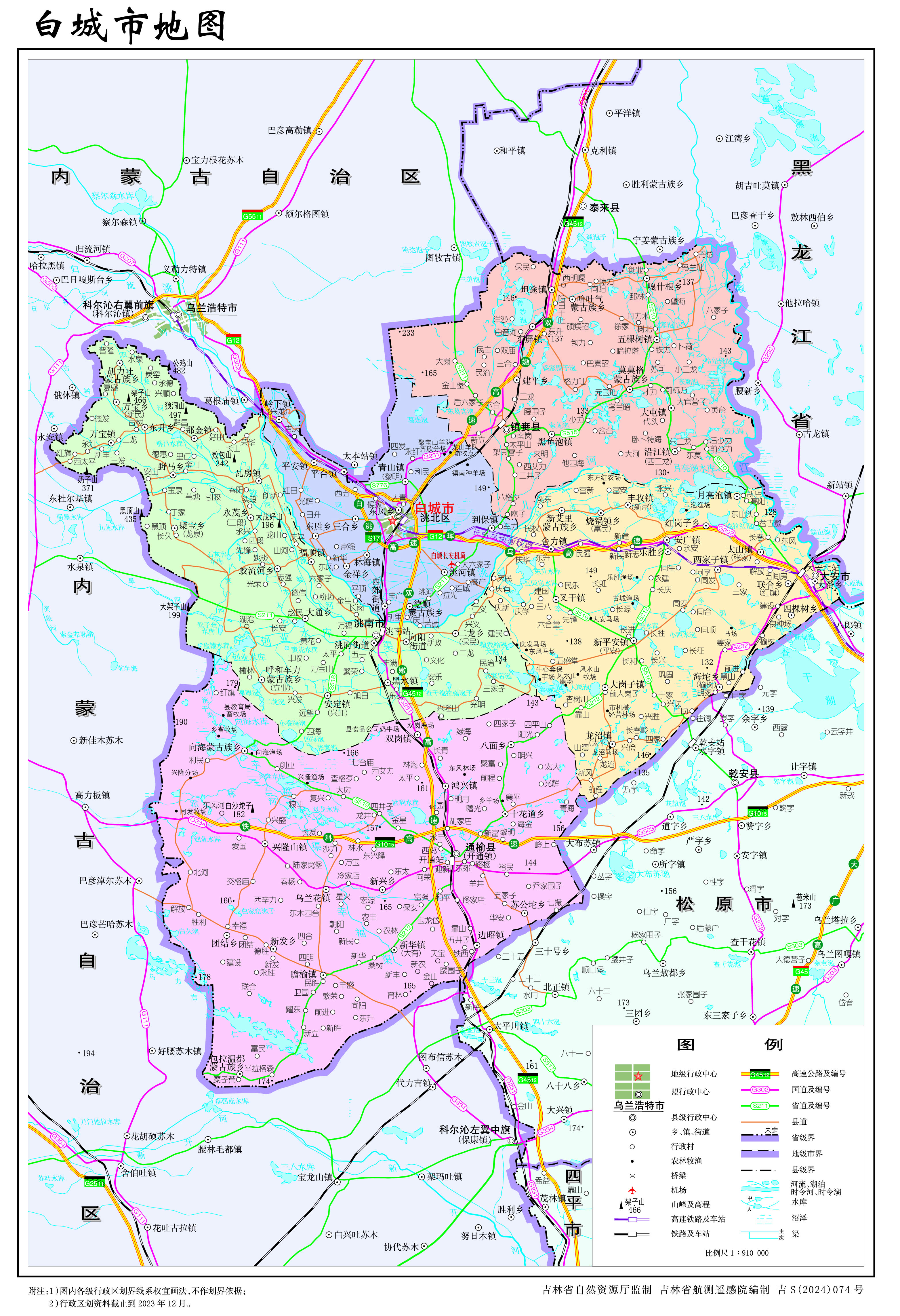 白城市轄1個市轄區(qū)、2個縣,代管2個縣級市: