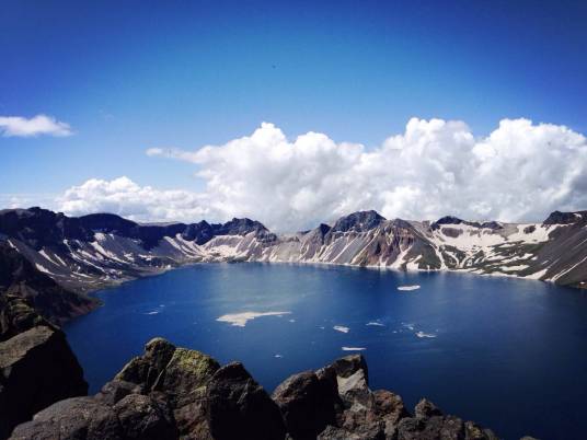 長白山天池,又稱白頭山天池,坐落在吉林省東南部長白山自然保護(hù)區(qū)內(nèi),是中國和朝鮮的界湖,雙方各擁有一部分水域。天池南北長約4400米,東西寬約3370米,其池水的海拔高度為2189.1米,最深處為373米,平均204米,水面面積9.82平方千米,周長13.1千米。據(jù)《長白山江岡志略》記載:“天池在長白山巔的中心點(diǎn),群峰環(huán)抱,離地高約20余里,故名為天池。”