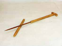 拐杖刀:俗稱“二人奪”,長約90厘米。表面上看呈拐杖型,木質(zhì)。但實(shí)際上,其前面是可以斷開的,拔出外鞘,里面是一個(gè)刺刀。這是抗日斗爭初期,東滿游擊隊(duì)和當(dāng)?shù)厝罕娪脕韺Ω稊橙说拿孛芪淦鳌J钱?dāng)時(shí)很流行很實(shí)用的武器。
