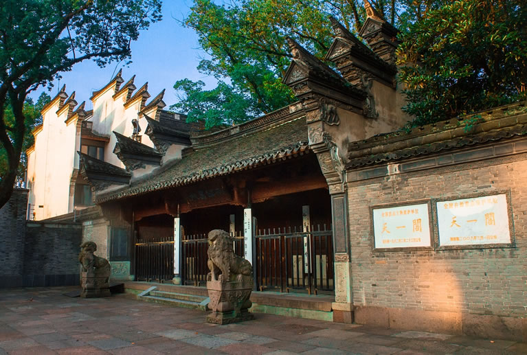天一閣,位于浙江省寧波市海曙區(qū),建于明嘉靖四十年至四十五年(1561年—1566年),由當(dāng)時(shí)退隱的明朝兵部右侍郎范欽主持建造,占地面積2.6萬(wàn)平方米,已有400多年的歷史。天一閣藏書(shū)樓坐北朝南,為兩層磚木結(jié)構(gòu)的硬山頂重樓式建筑,通高8.5米,斜坡屋頂,青瓦覆上。一層面闊、進(jìn)深各六間,二層除樓梯間外為一大通間,以書(shū)櫥間隔。閣前鑿“天一池”通月湖,園林以“福、祿、壽”作總體造型,用山石堆成“九獅一象”等景點(diǎn)。天一閣及其周圍園林具有江南庭院式園林特色。天一閣的藏書(shū)和建筑為研究書(shū)法、地方史、石刻、石構(gòu)建筑和浙東民居建筑提供了實(shí)物資料。