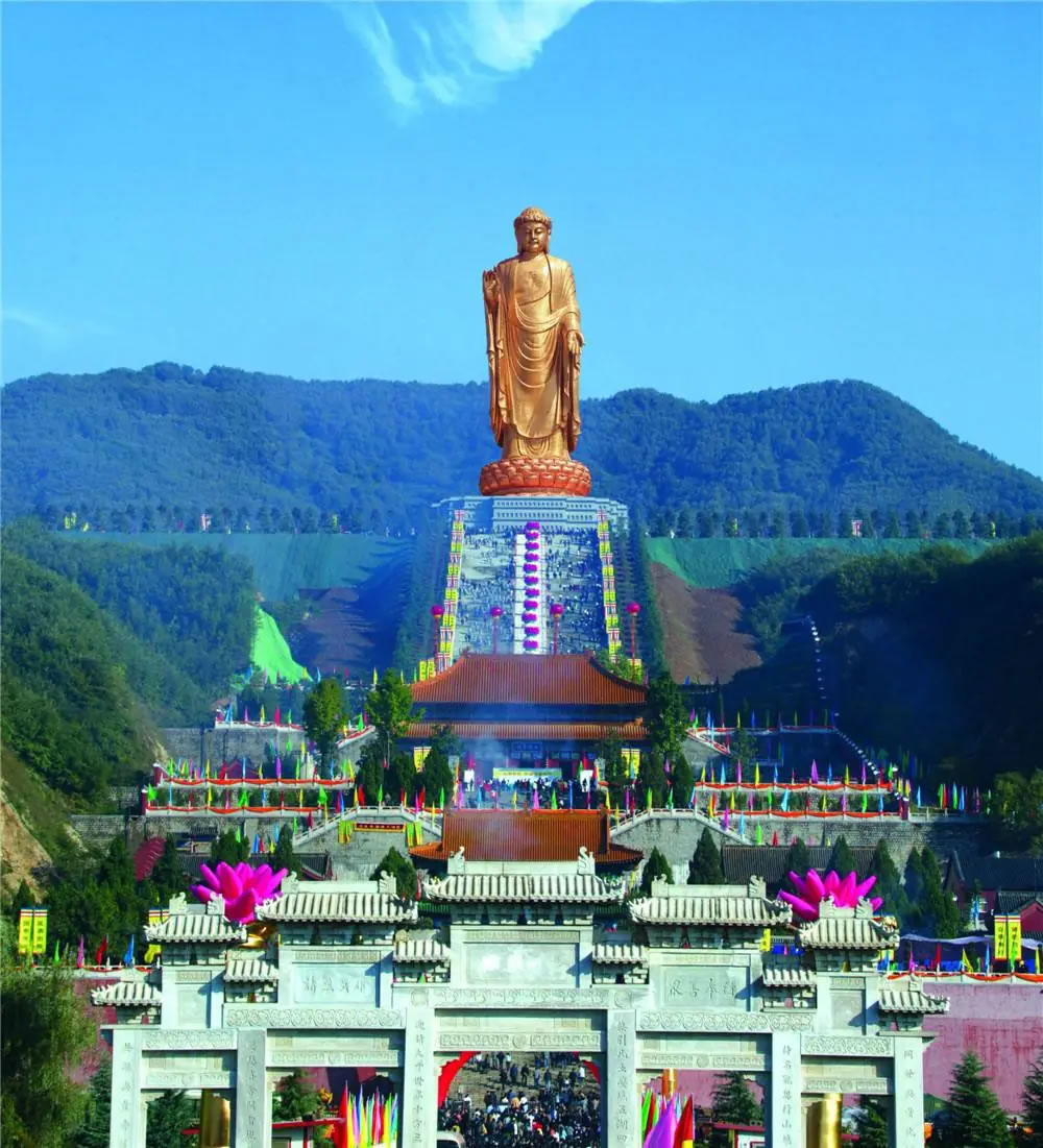 中原大佛景區(qū)位于河南省平頂山市魯山縣境內(nèi),地處伏牛山生態(tài)旅游黃金位置,景區(qū)規(guī)劃面積13.40平方千米。中原大佛景區(qū)由牌坊、佛泉寺、愿心臺、;鄞蟮、禮佛臺、中原大佛、吉祥鐘、佛教文化宮殿、文化碑廊等景點(diǎn)景觀組成。大佛總高208米,身高108米,蓮花座高20米,金剛座高25米,須彌座高55米,中原大佛整體佛像鑄造用銅3300噸,黃金108公斤,特殊鋼15000余噸,表面面積為11300平方米,通過焊接13300塊銅板而成。景區(qū)內(nèi)的天瑞吉祥金鐘凈重116噸,是載入《吉尼斯世界紀(jì)錄大全》的“世界最大外擊青銅鑄鐘”,世界佛光總會(huì)會(huì)長、臺灣佛光山開山宗長星云大師為大佛題寫“世界第一中原大佛”大字,大佛前還有有四季長流的沙河圣水,佛泉湯、佛泉寺、中原釋迦大佛、天瑞吉祥鐘等景觀。