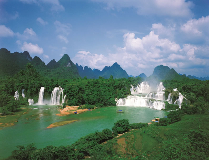 - 看點:壯族英雄儂智高紀念地,遠眺越南村落,古寺飛檐與瀑布同框。
