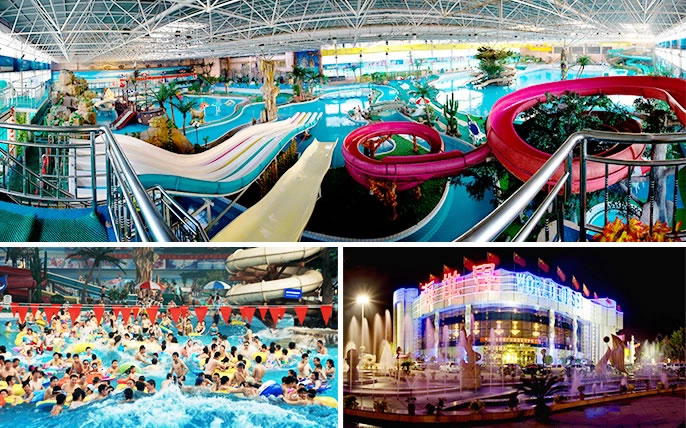 石家莊天山海世界是國內(nèi)較大的室內(nèi)恒溫水上戲水項(xiàng)目,是按國家AAAAA級標(biāo)準(zhǔn)全力打造的全民健身樂園,坐落在河北省石家莊高新技術(shù)開發(fā)區(qū)。建筑面積約5萬平方米,總投資達(dá)10億人民幣,室內(nèi)凈高30多米。占地130余畝。該項(xiàng)目以“水”為主體,處處體現(xiàn)了水的存在。萬余平方米的戲水大廳,分兒童戲水區(qū)、成人戲 水區(qū)、按摩區(qū)、造浪區(qū)及漂流河。為了滿足冬泳的需要,戲水大廳設(shè)置了恒溫設(shè)備,保持了室溫30℃,水溫28℃;為了解決水質(zhì)問題采用了24小時(shí)不間斷循環(huán)水消毒,使水的純凈度達(dá)到國際標(biāo)準(zhǔn);另外特設(shè)了一次能容納200余人的快餐廳,以及桑拿、保健、按摩等設(shè)備設(shè)施。