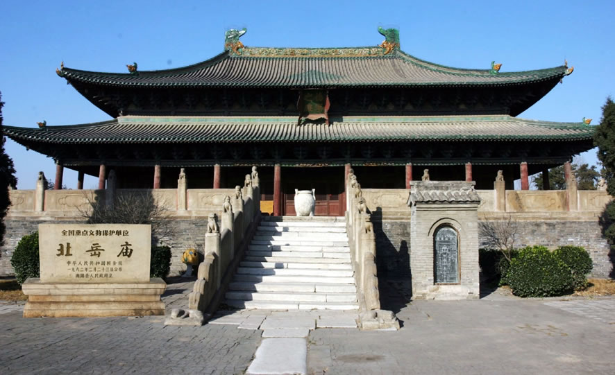 北岳廟,漢稱北岳祠,唐稱北岳安天王廟,宋稱北岳安天元圣帝廟,元稱北岳安天大貞元圣帝廟,到明時去掉歷代所加封號,改稱為北岳廟,坐落在河北省保定市曲陽縣城西部恒州鎮(zhèn)北岳路2號,始建于南北朝時期北魏景明、正始年間(500—512年),清順治十七年(1660年)以前,北岳廟一直是歷代封建帝王祭祀北岳恒山之神的場所,總占地面積為173982平方米。北岳廟建筑格局呈坐北朝南的“田”字形,采用的是以中軸線為主,兩廂對稱的傳統(tǒng)建筑形式。廟內(nèi)主體建筑德寧之殿在中軸線北端,往南依次建有飛石殿、三山門、凌霄門、御香亭、朝岳門、牌坊、石橋等。北岳廟是一座內(nèi)涵豐厚的文化藝術(shù)殿堂,集古建、繪畫、書法、石雕、定瓷等藝術(shù)于一身。北岳廟碑刻對研究所處時代的政治、經(jīng)濟(jì)、文化以及書法藝術(shù)的演變,提供了珍貴的實(shí)物資料。