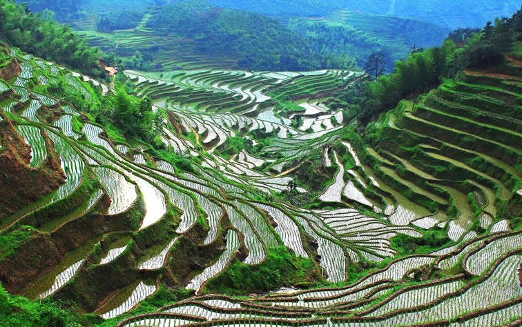 - 亮點(diǎn):梯田如巨龍盤旋而下,春季灌水時(shí)形成“鏡面梯田”,倒映云影天光。