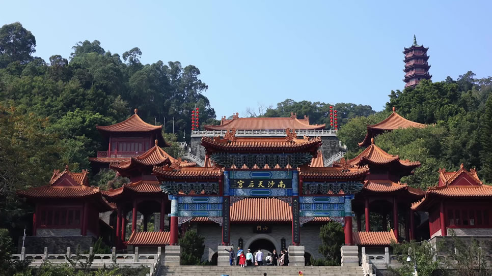 廣州南沙天后宮,又叫“媽祖廟”,位于廣東省廣州市南沙區(qū)天后路88號(hào),坐落于大角山東南麓,地處粵港澳大灣區(qū)之心,瀕臨珠江出?诘牧尕暄螅嫉孛娣e達(dá)18萬平方米。廣州南沙天后宮前身是明代建于鹿頸村的天妃古廟,清乾隆年間經(jīng)重修定名為元君古廟,抗戰(zhàn)時(shí)期被日寇飛機(jī)炸毀,而后于1994年重建。廣州南沙天后宮是為紀(jì)念海上女神林默而建,是一個(gè)以媽祖文化為主題的景區(qū),是粵港澳大灣區(qū)媽祖文化交流中心,亦是東南亞最大之媽祖廟。廣州南沙天后宮采用清式建筑對稱布局,高低錯(cuò)落地依山而建,建筑的特點(diǎn)集北京故宮的風(fēng)格和南京中山陵的氣勢于一體,規(guī)模為現(xiàn)今世界同類建筑之最。廣州南沙天后宮由廣場、宮殿和南嶺塔三部分構(gòu)成,“天后八景”包括:濱海銀灘朝陽、五彩靈徑、媽祖靈釵、“南沙人”遺址、靈宮賜福、南嶺夕照、抗戰(zhàn)神炮、默娘之家八個(gè)景點(diǎn)。