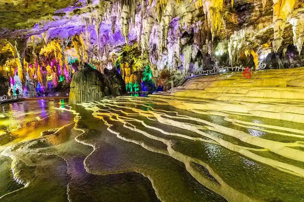 - 核心特色:洞內分四層結構,已開放第二層約2公里游覽線,包含五大主題廳——吉星迎賓、壯鄉(xiāng)聽海、云山鑒水、詩畫田園、幽靜奇觀。景觀涵蓋鈣華池梯田、神象賜福、天下第一鐘等1000余處天然獨立景觀,其中鈣華池群面積達6000平方米,黑白對比形成獨特視覺奇觀。