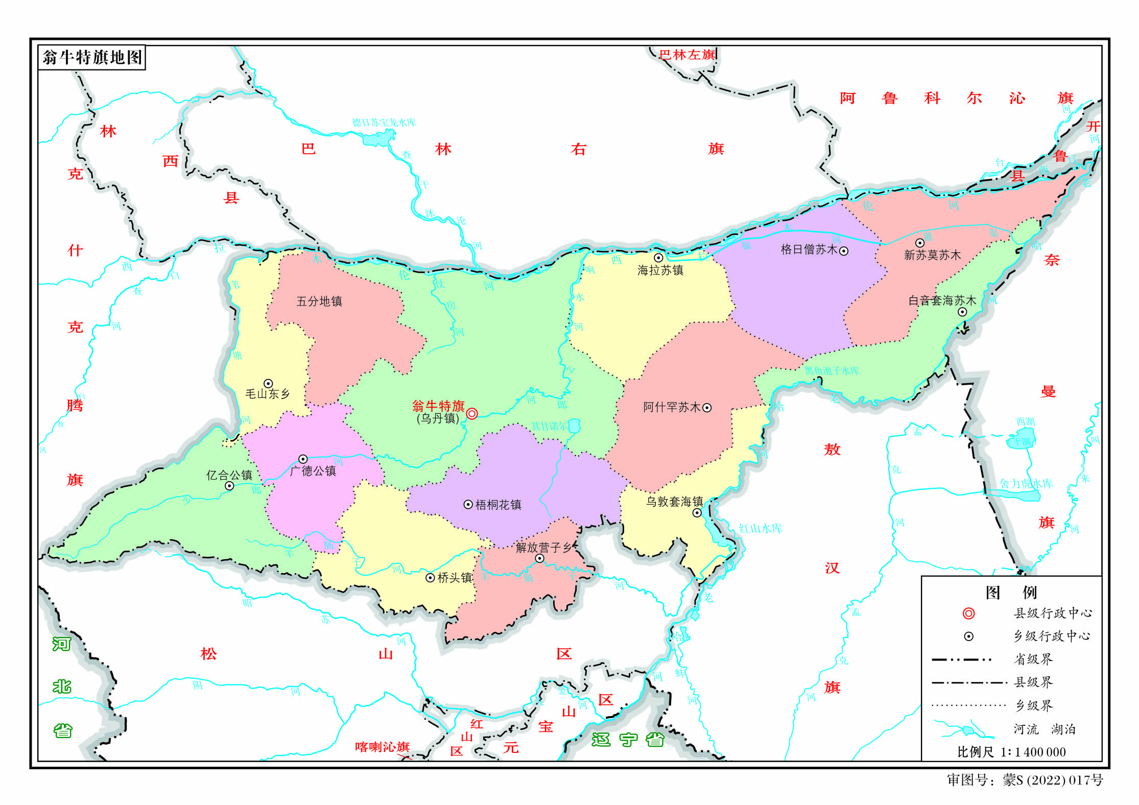 鎮(zhèn):烏丹鎮(zhèn)、橋頭鎮(zhèn)、梧桐花鎮(zhèn)、廣德公鎮(zhèn)、億合公鎮(zhèn)、五分地鎮(zhèn)、烏敦套海鎮(zhèn)、海拉蘇鎮(zhèn)