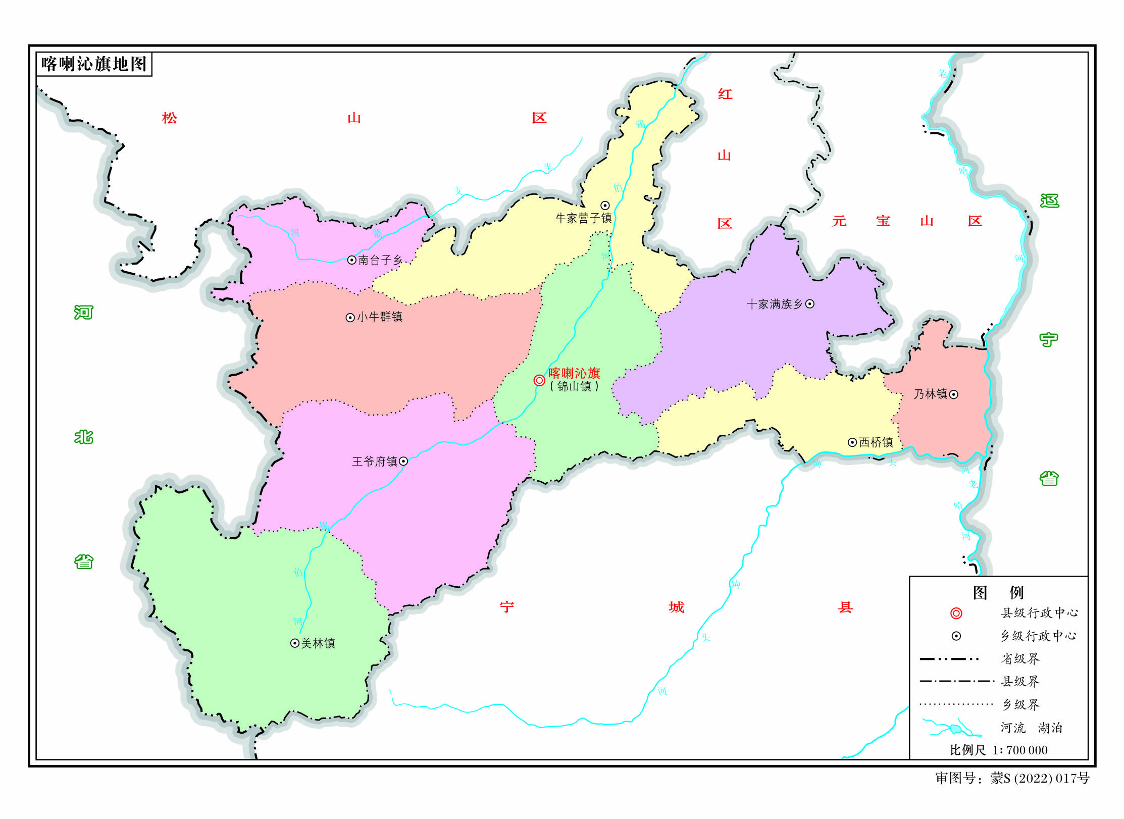 喀喇沁旗轄6個(gè)鎮(zhèn)、11個(gè)鄉(xiāng)(其中1個(gè)民族鄉(xiāng)),乃林果樹農(nóng)場、馬鞍山羊場: