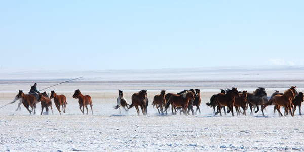冬季那達(dá)慕 每年十二月,在巴彥呼碩敖包山上舉行,是冬季草原牧區(qū)生活的集中展示。雪地賽馬,賽駱駝,馬拉雪橇、雪地博克盡顯北方少數(shù)民族的豪氣和強(qiáng)悍,也是冬季風(fēng)情和服飾的大展臺(tái),是草原人們挑戰(zhàn)寒冷、超越自我的盛會(huì)。