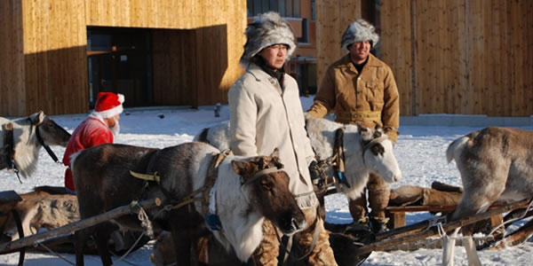 敖 生態(tài)環(huán)境 這里是森林與草原的界線,大興安嶺和呼倫貝爾大草原在這里交匯,一邊是草原、河流,一邊是森林、山崗,空氣新鮮,野味十足,當(dāng)?shù)厝税氘?dāng)真的說"這地方絕對沒有污染,連蒼蠅、蚊子都是綠食食品"。 國家給敖魯古雅鄉(xiāng)人建立了定居地,但馴鹿只能生活在森林里,所以除了在定居點的部分村民,密林中還散布著五個馴鹿站,最遠的在150公里。過去,敖魯古雅人養(yǎng)馴鹿只是作為運輸工具,一頭馴鹿可以負重35公斤左右,每小時可以行走5公里,1964年,取得了割鹿茸成功。現(xiàn)在,馴鹿已經(jīng)不大用來運輸了,而成了當(dāng)?shù)厝说闹饕?jīng)濟來源,中國唯一的這群馴鹿大約只有10000只左右了。 敖鄉(xiāng)民俗村 敖魯古雅鄂溫克民俗村位于根河市西郊,南臨S301國道,交通十分便利。民俗村總建筑面積58,700平方米,是集大中型會議、休閑度假、民俗展示、娛樂為一體的綜合性旅游度假村,是一處自然——人文旅游 景觀。 民俗村依托森林、河流,鄂溫克獵民的民俗民風(fēng),推出一系列具有地方特色的旅游活動項目:主要有森林觀光、探險、模擬狩獵;觀民族宗教、歌舞、民俗表演;品嘗民族風(fēng)味餐、參觀敖鄉(xiāng)新居、訪獵民等活動;村內(nèi)建有木質(zhì)別墅式的游客服務(wù)中心,民俗文化博物館、民俗表演平臺、表演廳和餐廳、反映鄂溫克獵民歷史的圖騰廣場、有四十、五十、六十年代不同的撮羅子,有上山索道車、木橋和四處風(fēng)格獨特的獵民點;還有民俗表演隊和馴鹿車穿行其中,可對敖魯古雅鄂溫克獵民的歷史、文化、宗教、習(xí)俗進行了充分的展示。 敖魯古雅鄉(xiāng)距離我國最北端的漠河縣約一百公里左右的路程,位于大興安嶺深處的滿歸林區(qū)。這里氣候十分寒冷,記者走在蜿蜒的山路上,腳下的積雪發(fā)出“咯吱咯吱”的脆響,眼前已是呵氣成冰,身上的棉襖凍得硬梆梆的。隨行的鄉(xiāng)黨委書記鮑玉林說:“現(xiàn)在大約是零下30攝氏度,你們趕上好時候了,往年這個時候得有零下五十度,外面到處冒白煙。” 敖魯古雅鄉(xiāng)有一條主干道,長不過二三百米。道兩邊是整齊的幾排木刻楞房和磚瓦房,象征著主人的富裕程度。敖鄉(xiāng)雖小,卻擁有自己的博物館、學(xué)校、文化站和小商店。春節(jié)雖過,但喜慶氣氛尚濃,白雪映襯下,墻上的大紅對聯(lián)分外惹眼。 敖鄉(xiāng)生活著近500人,其中鄂溫克人大約有230人。他們現(xiàn)在已經(jīng)是獵民定居后的第三代了。在離此50到100多公里的山林中,還有四個獵民點,生活著30多名習(xí)慣于打獵和在山上飼養(yǎng)馴鹿的老獵民們。