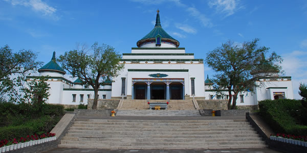 成吉思汗廟坐落在興安盟烏蘭浩特市罕山之巔,始建成于1940年,這座融漢、蒙、藏三個(gè)民族建筑風(fēng)格于一體的廟宇,從正面看是"山"字形。正殿當(dāng)中有16根粗大的紅漆明柱,四周繪有反映成吉思汗業(yè)績的精美圖案,中央為2.8米高的成吉思汗銅像;兩偏殿陳列有元代的兵器,服裝,瓷器等復(fù)制品,山門到正殿有寬10米、長158米用花崗巖砌成的81級(jí)臺(tái)階。成吉思汗廟融蒙、漢 、藏三個(gè)民族的建筑風(fēng)格于一體, 采取古代漢族建筑中慣用的中軸對(duì)稱布局手法,建筑主體圓頂方身,綠帽白墻,具有典型的蒙、藏建筑特色。