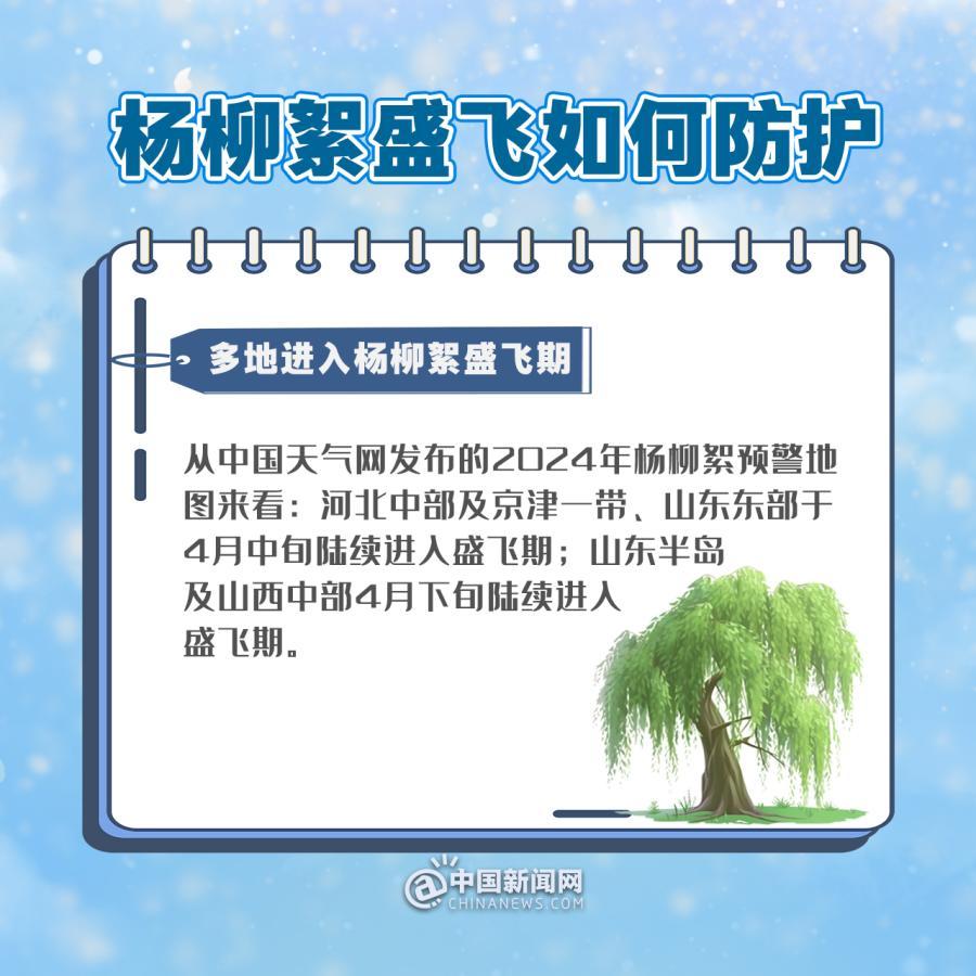 從中國(guó)天氣網(wǎng)發(fā)布的2024年楊柳絮預(yù)警地圖來(lái)看:河北中部及京津一帶、山東東部于4月中旬陸續(xù)進(jìn)入盛飛期;山東半島及山西中部4月下旬陸續(xù)進(jìn)入盛飛期。楊柳絮都有哪些危害?公眾日常如何做好防護(hù)?