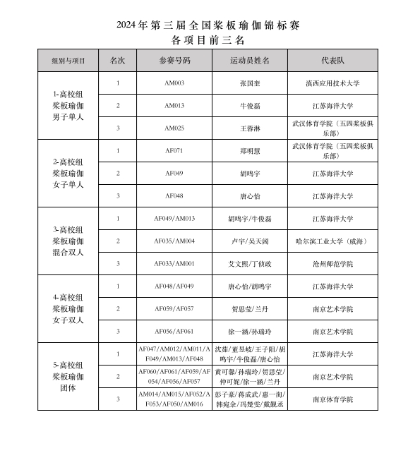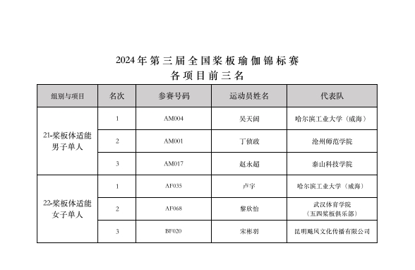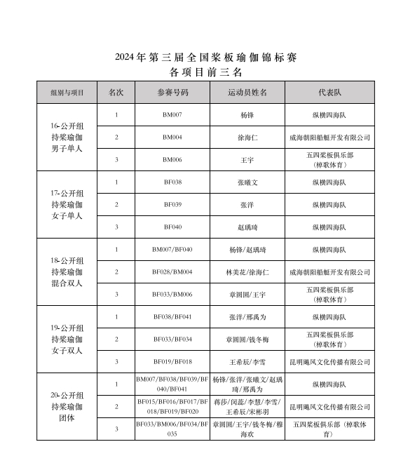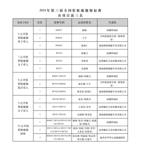 最終經過為期兩天的激烈競賽,“意爾康杯”2024年第三屆全國槳板瑜伽錦標賽共決出槳板瑜伽、持槳瑜伽、槳板體適能等3大類共22項比賽各項前三名的獲獎名次。
