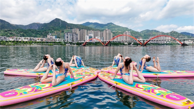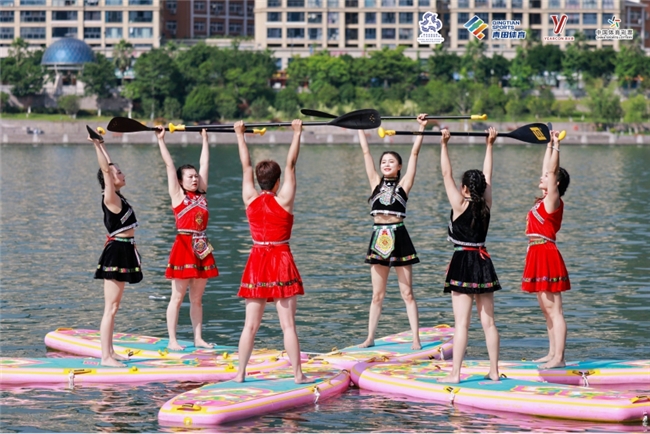 前屈、后彎、扭轉、平衡、倒置……音樂與動作和諧統(tǒng)一,身體與槳板融為一體。參賽隊員們展示的不僅是控制身體的力量,更是人與自然、美與健康的完美結合,圍觀群眾不時給予陣陣掌聲。