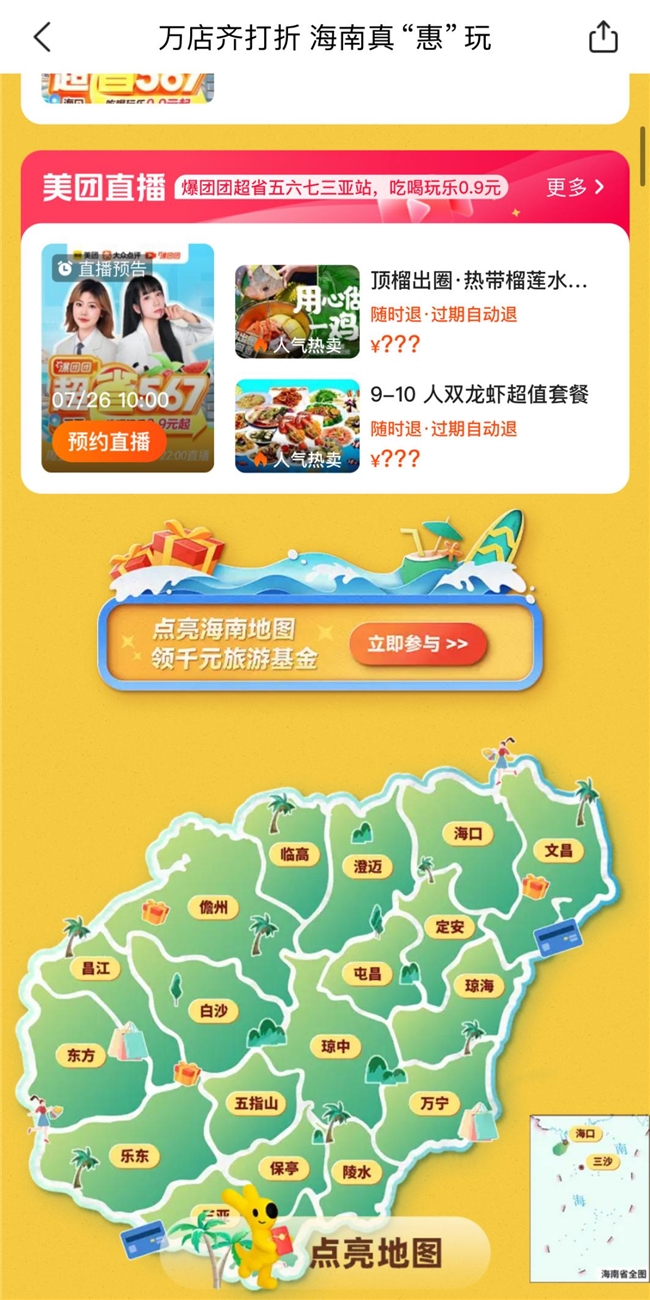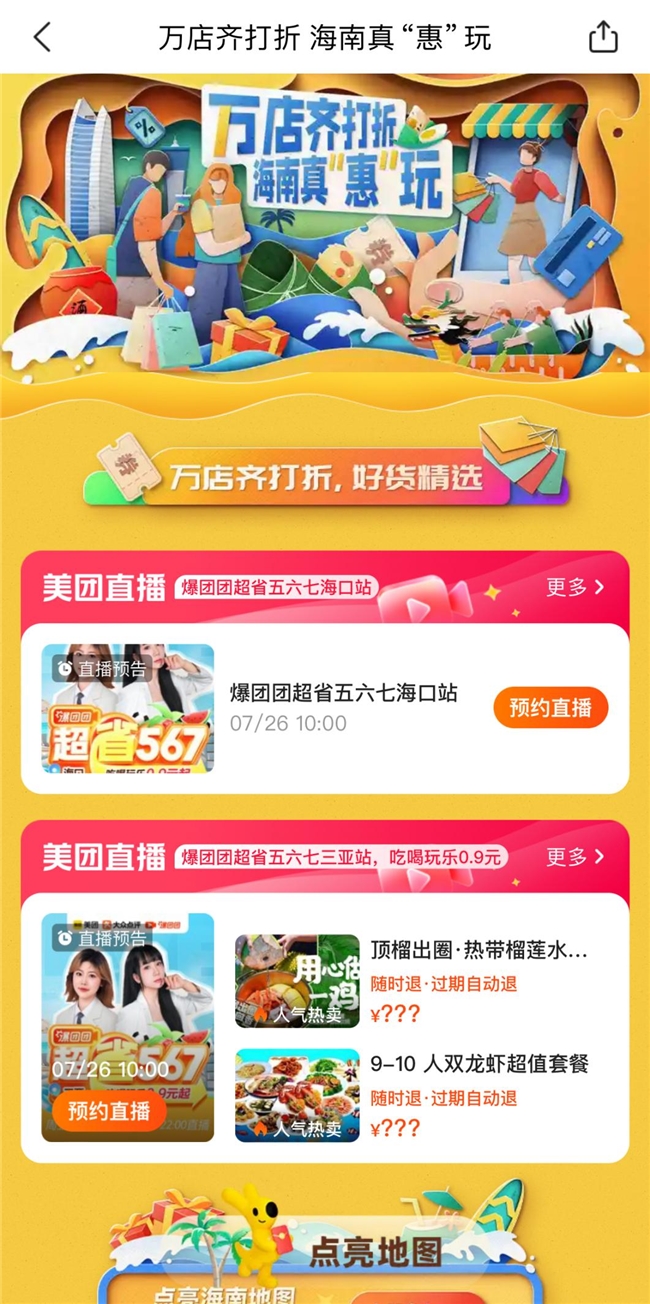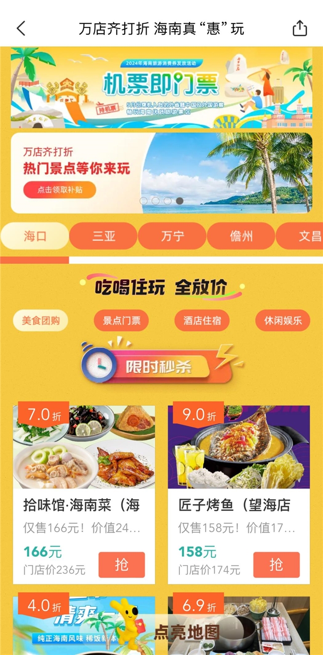 “萬店齊打折 海南真惠玩”主題營銷活動由海南省旅游和文化廣電體育廳和美團(tuán)聯(lián)合發(fā)起,活動覆蓋了海南省內(nèi)十八個城市,全品類商家紛紛參與,為游客們帶來了前所未有的優(yōu)惠和福利。活動期間海南省旅文廳聯(lián)合美團(tuán)攜手一萬家商戶,為廣大消費(fèi)者和游客提供了不低于1000萬遠(yuǎn)的補(bǔ)貼折扣,用戶只要在美團(tuán)App、大眾點(diǎn)評App搜索“萬店齊打折”等字樣,即可進(jìn)入專題頁,參與各類福利活動。