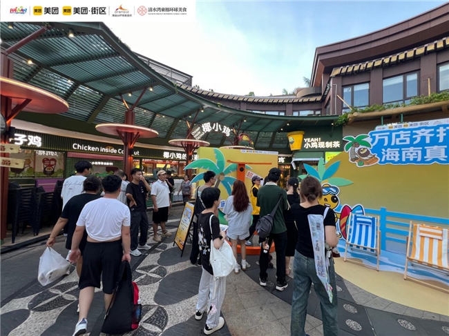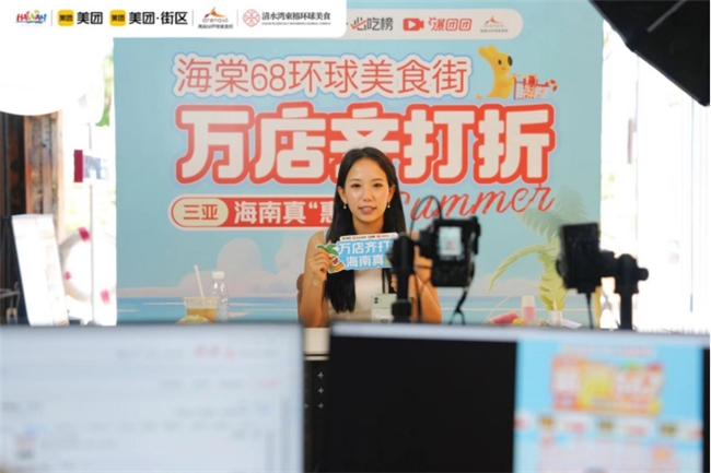 三亞海棠68環(huán)球美食街區(qū)同樣熱鬧非凡,“爆團(tuán)團(tuán)”爆品直播間活動落地線下,各種街區(qū)爆款秒殺活動讓游客們應(yīng)接不暇。
