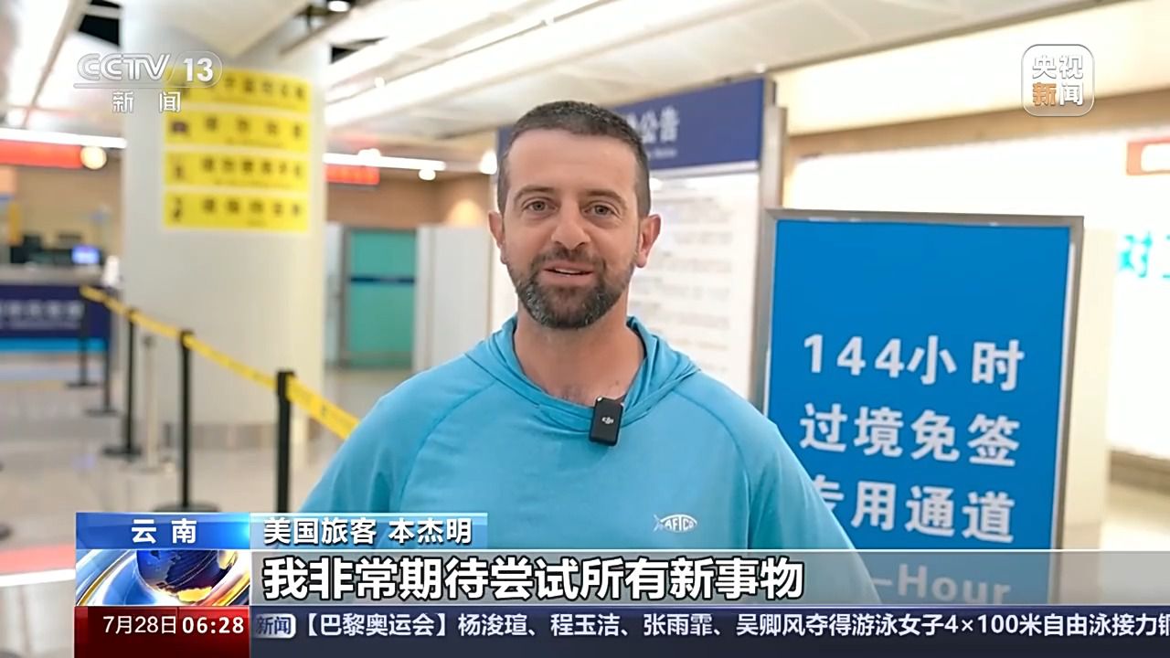 7月16日,在昆明國際機場,美國旅客本杰明,成為云南省144小時過境免簽政策停留范圍擴大后首位享受政策便利的旅客。