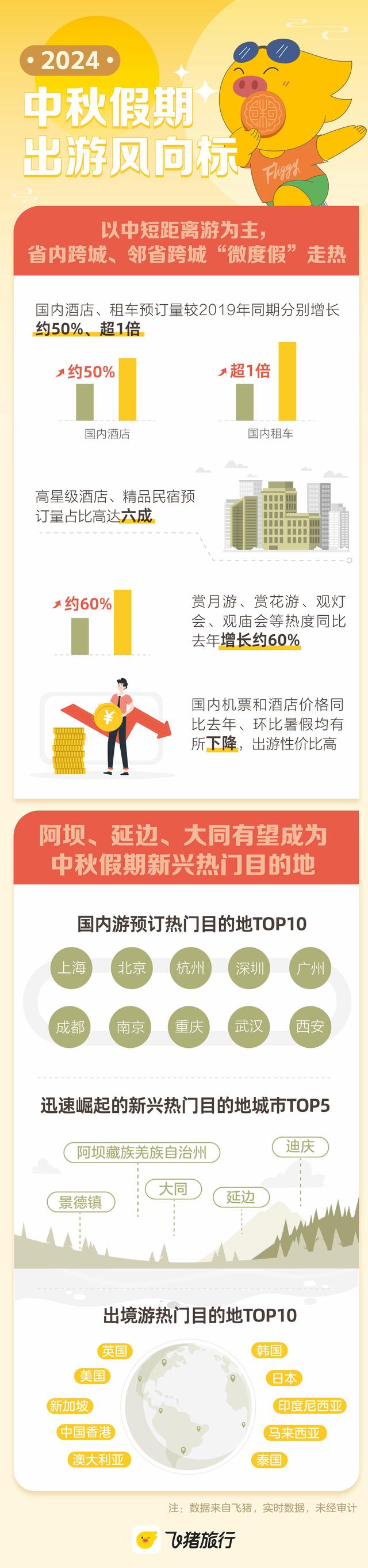 飛豬數(shù)據(jù)顯示,截至目前中秋假期國(guó)內(nèi)酒店預(yù)訂量較2019年同期增長(zhǎng)約50%,其中高星級(jí)酒店、精品民宿預(yù)訂量占比高達(dá)六成。江浙滬、廣深珠、京津、川渝都市圈內(nèi)的特色酒店、民宿和度假村,該特征更為明顯。