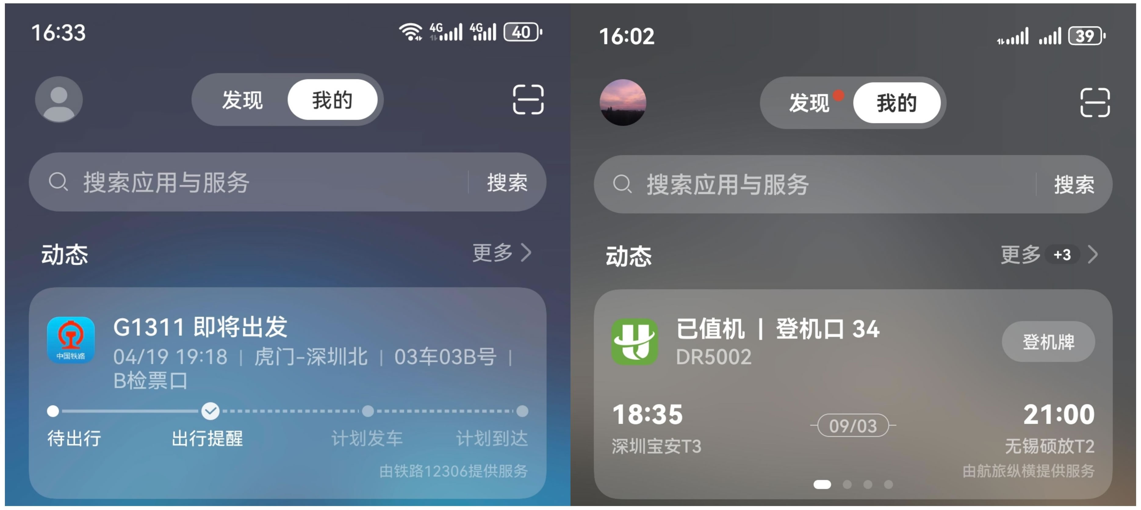 假期出行高峰期,高鐵飛機(jī)可能會(huì)晚點(diǎn)、延誤,出行信息繁多且易忘。華為負(fù)一屏提供的實(shí)時(shí)動(dòng)態(tài)卡片就非常實(shí)用。在負(fù)一屏打開航班、火車服務(wù)通知,綁定賬號(hào)后,只需手機(jī)桌面右滑至負(fù)一屏,即可查看12306火車或航旅縱橫航班實(shí)時(shí)動(dòng)態(tài),輔助旅途中行程安排準(zhǔn)確及時(shí)、防止遺忘重要信息。