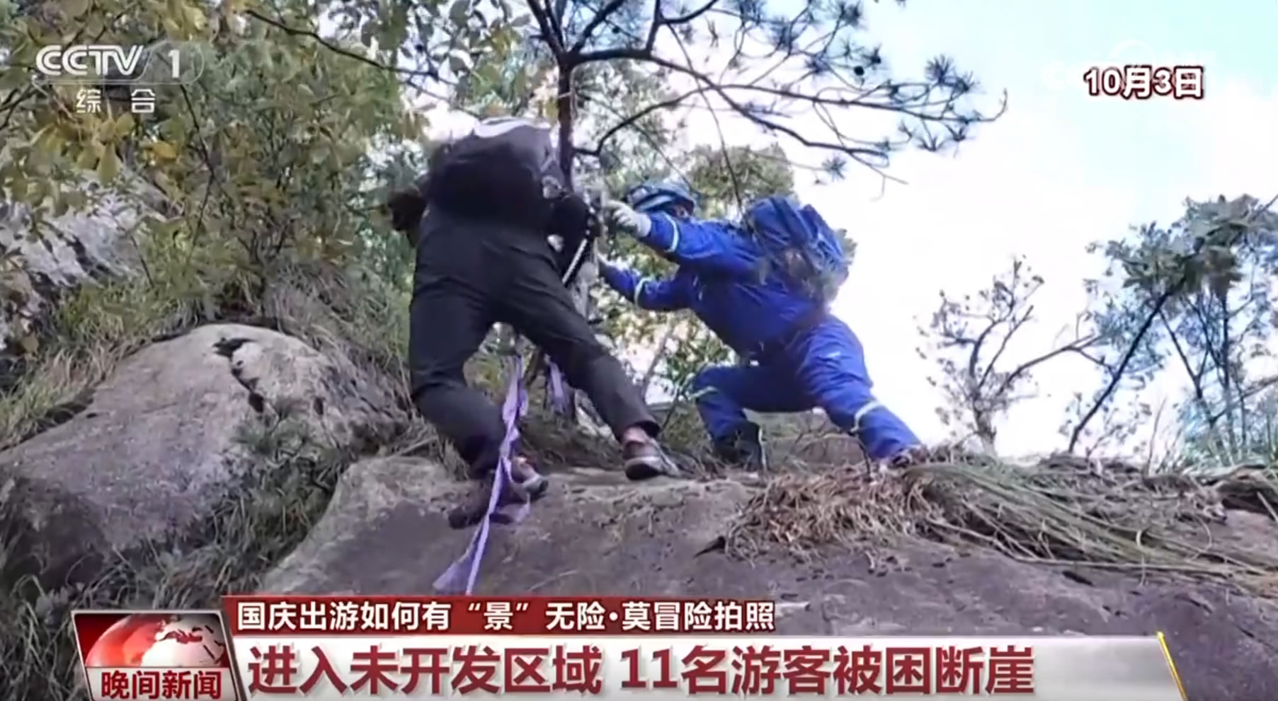 10月2日傍晚,有11名外地游客在安徽績溪縣一座未開發(fā)的山上攀爬時,因為迷路導(dǎo)致被困,當?shù)毓埠兔耖g救援隊立即展開聯(lián)合救援。在3日凌晨一點多,救援人員找到了被困游客,由于游客被困的地方是未開發(fā)的區(qū)域,山勢十分陡峭,且有多處斷崖,救援人員只能反復(fù)利用繩索,將被困游客挨個兒送至安全地帶。