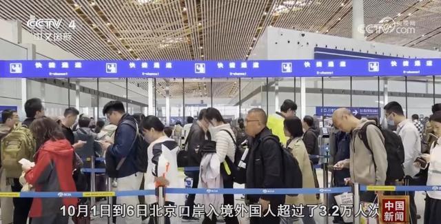 北京邊檢總站執(zhí)勤三大隊執(zhí)勤二隊副隊長池尚琨稱:“10月1日到6日,北京口岸入境外國人超過3.2萬人次,約是去年同期的2.14倍。”