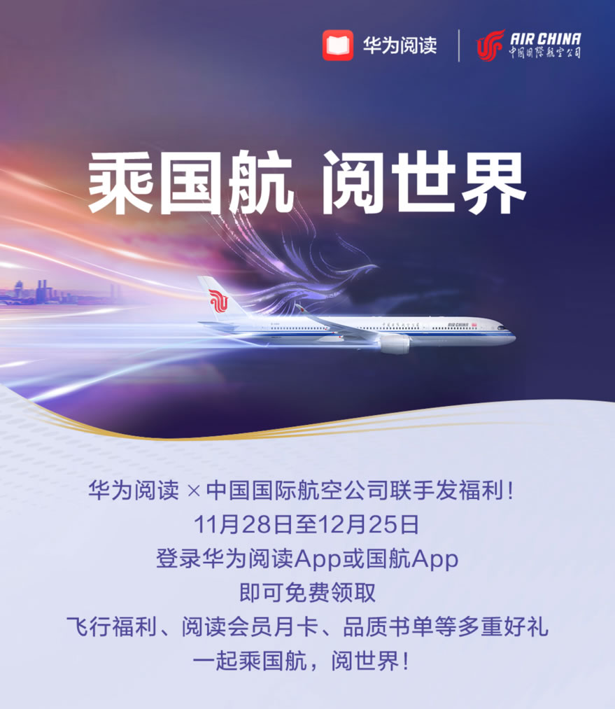 為了豐富旅客的飛行時(shí)光,近日華為閱讀與中國國際航空公司攜手,正式啟動了“乘國航 閱世界”國航伴讀計(jì)劃,該計(jì)劃通過整合華為閱讀的豐富資源與國航的全球航線網(wǎng)絡(luò),為用戶打造一個(gè)旅行中的高品質(zhì)閱讀空間。參與此次活動的用戶將可免費(fèi)領(lǐng)取3重好禮!包含了國航用戶多重福利、30天華為閱讀會員、精選國航伴讀書單,帶旅客悅享旅途的美好。