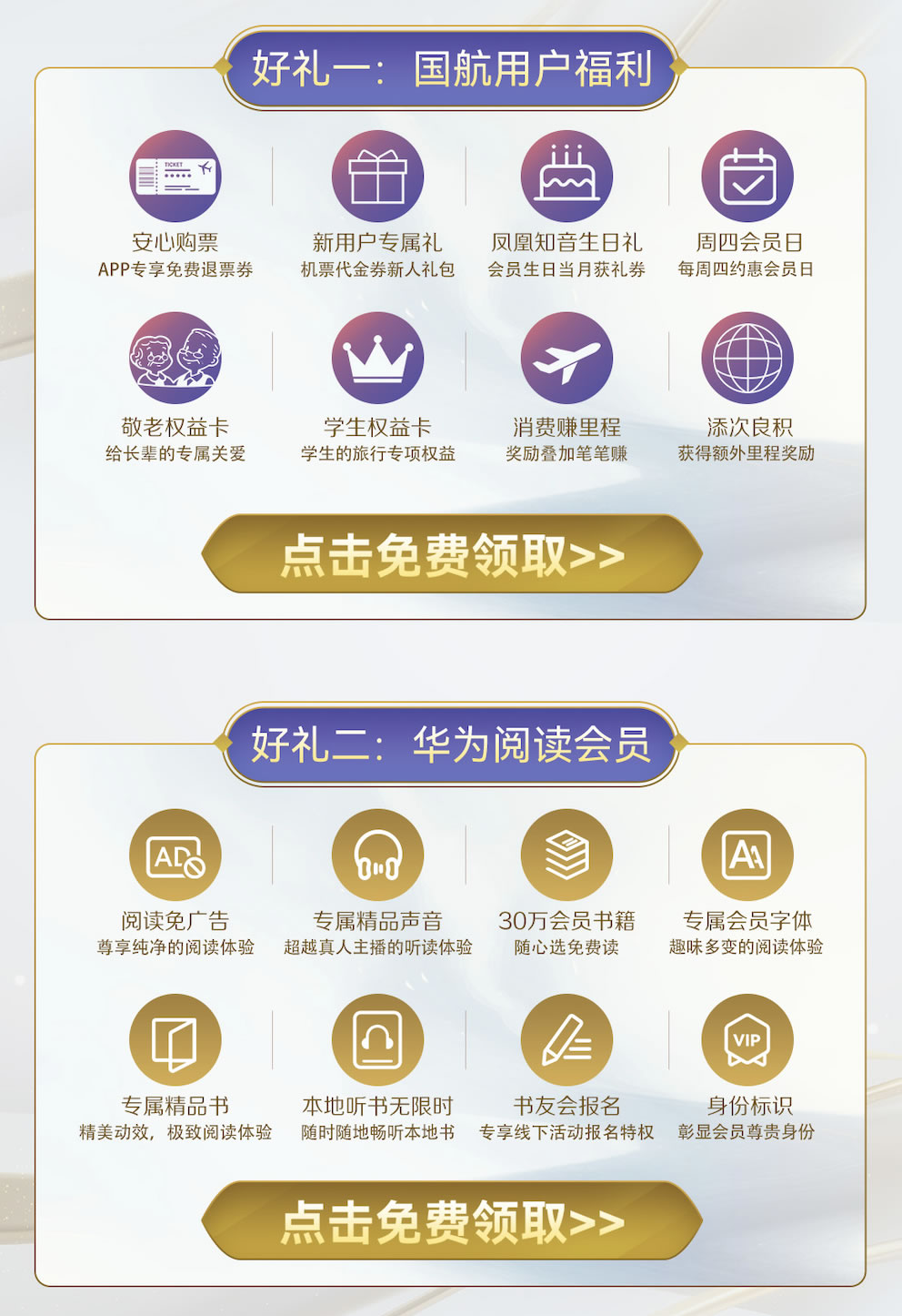 本次活動中,國航為用戶提供了退票券、生日禮、敬老權(quán)益卡、學(xué)生權(quán)益、新人專屬禮券等一系列大禮包。華為閱讀則為國航的用戶提供了30天閱讀會員的專屬福利!領(lǐng)取后可以享受超百家知名出版社30萬冊版權(quán)會員書籍免費(fèi)讀,不僅可以免費(fèi)使用專屬會員字體閱讀,還能獲得免廣告的純凈體驗(yàn)。同時(shí),喜愛聽書的用戶還可以使用專屬的精品聲音聽書,本地聽書無限時(shí),加入書架的書籍還內(nèi)置了專屬精品聲音,給用戶帶來超越真人主播的聽讀體驗(yàn)。華為閱讀還會定期組織線下書友會,領(lǐng)取會員后可專享書友會優(yōu)先報(bào)名特權(quán)!
