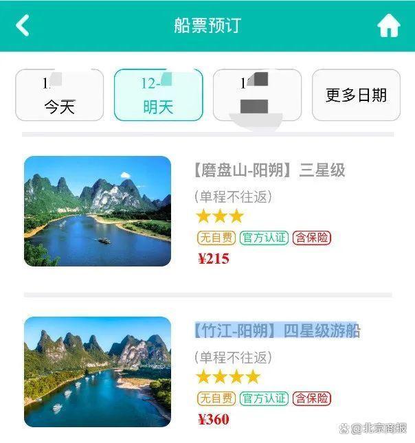 進(jìn)一步來(lái)看,漓江風(fēng)景區(qū)船票購(gòu)買界面提供的215元的“【磨盤山-陽(yáng)朔】三星級(jí)”和360元的“【竹江-陽(yáng)朔】四星級(jí)游船”選項(xiàng)中,雖然顯示“含保險(xiǎn)”,但并未說(shuō)明保費(fèi)與承保的保險(xiǎn)公司,乃至保障責(zé)任等信息。