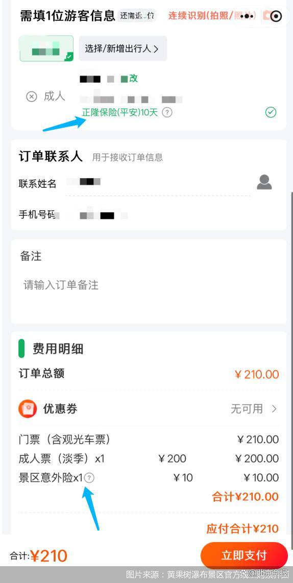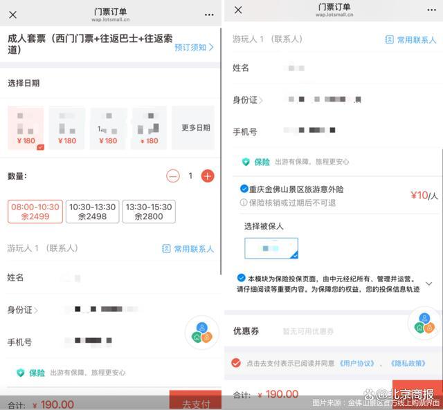 比如,游客在黃果樹(shù)瀑布景區(qū)官方線上渠道購(gòu)票時(shí),在提交訂單界面,會(huì)捆綁有一份“景區(qū)意外險(xiǎn)”,顯示為10元。當(dāng)記者填寫完身份信息后,在身份信息旁會(huì)出現(xiàn)“正隆保險(xiǎn)(平安)10天”字樣,并且進(jìn)行了默認(rèn)勾選,如果不需要購(gòu)買保險(xiǎn),則需要取消該選項(xiàng)的勾選。