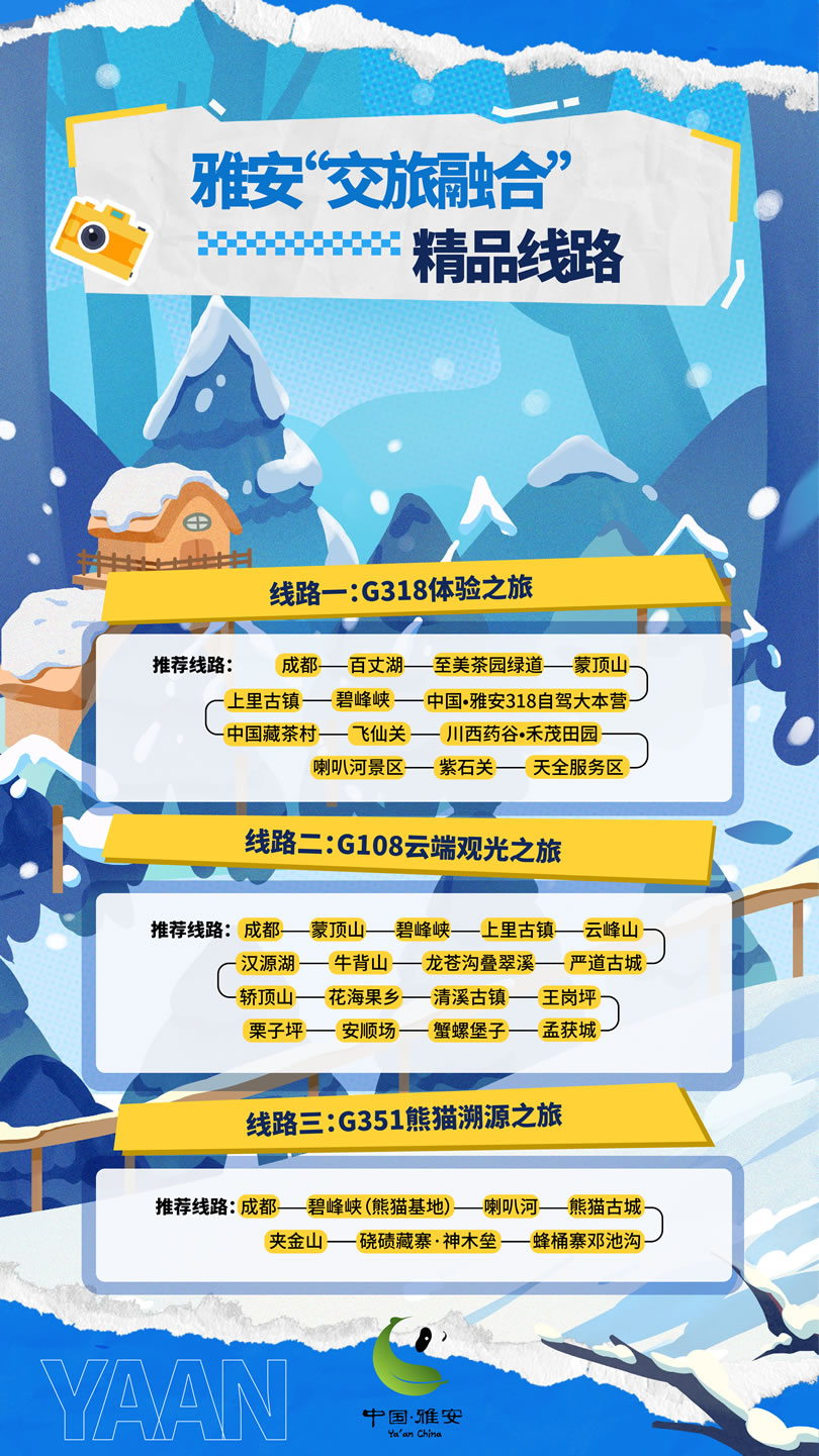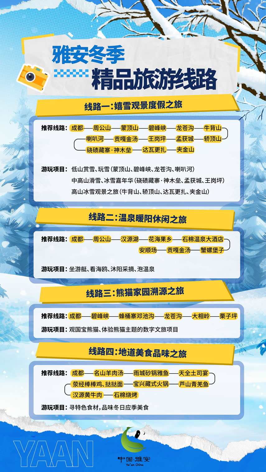 這個冬天,雅安市圍繞冰雪、溫泉、熊貓、美食,推出4條冬季精品旅游線路,圍繞國道318、108等交旅資源,推出3條“交旅融合”精品線路,最大程度滿足游客的冬游需求。將以冰雪為序,溫泉為媒,熊貓為邀,美食為禮,誠邀四方游客共赴一場難忘的旅行盛宴,邀請各地游客來“綠美雅安 熊貓家園”暢享冰天雪地的快樂,盡享溫泉暖陽的愜意,邂逅“風花雪月”的故事。