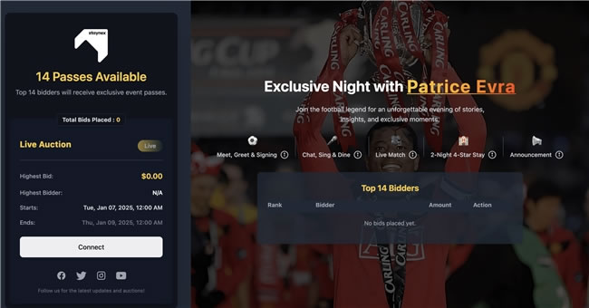 此外,活動現(xiàn)場將見證 STAYNEX 與 Patrice Evra 的簽約儀式,并獲取精美禮品、幸運抽獎和獨家優(yōu)惠。具體相關(guān)權(quán)益或競拍鏈接以及競拍教程請查看STAYNEX.VIP 官方說明。