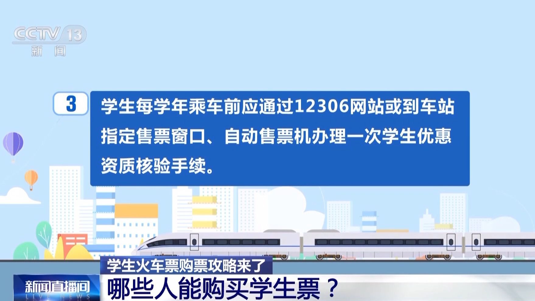 國鐵南昌局廈門北站客運值班站長 吳振斌:現(xiàn)在中國高等教育學(xué)生信息網(wǎng)和鐵路12306系統(tǒng)已實現(xiàn)信息對接,學(xué)生旅客每學(xué)年乘車前可通過鐵路12306App在線辦理學(xué)生優(yōu)惠資質(zhì)核驗手續(xù)。