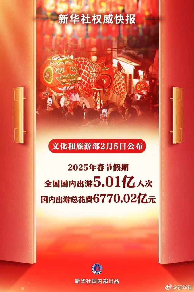 2月5日,文化和旅游部公布春節(jié)假期最新數(shù)據(jù):春節(jié)假期8天,全國(guó)國(guó)內(nèi)出游5.01億人次,同比增長(zhǎng)5.9%;國(guó)內(nèi)出游總花費(fèi)6770.02億元,同比增長(zhǎng)7.0%。全國(guó)出游人次和總花費(fèi)再創(chuàng)新高!