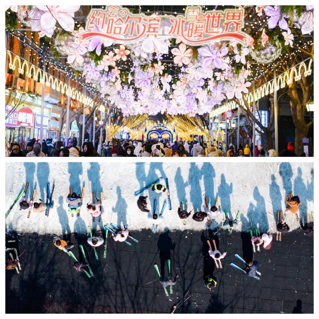 拼圖:(上圖)1月30日,游客在哈爾濱中央大街上游玩、拍照。(下圖)2月3日,游客在江蘇省淮安市馬頭鎮(zhèn)的古運(yùn)河滑雪場(chǎng)滑雪(無(wú)人機(jī)照片)。