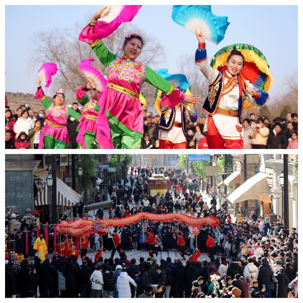 拼圖:(上圖)2月2日,在河北省石家莊市井陘縣天長(zhǎng)宋古城,民俗藝人為游客表演井陘拉花。(下圖)2月3日,游客在山東省樂(lè)陵市影視城觀看舞龍表演。