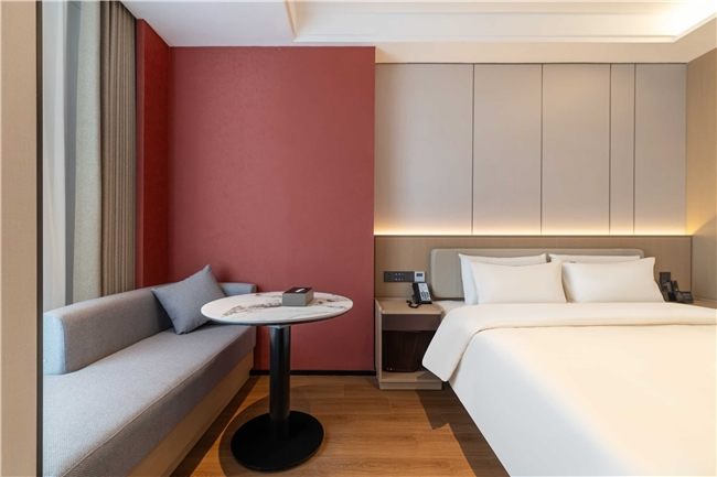 酒店共設(shè)125間豪華客房,涵蓋高級(jí)房、行政房、親子房及行政套房等多種房型。設(shè)計(jì)以“海棠紅”與“寶石紅”為主色調(diào),融合現(xiàn)代雅致與地域文化元素,營造淡泊素雅的藝術(shù)氛圍?头颗鋫渲悄苷Z音助手、智能門鎖、燈光控制系統(tǒng)等科技設(shè)施,打造沉浸式智慧旅居空間。公共區(qū)域還設(shè)有大堂吧、書吧、茶室、中餐廳、會(huì)議室、健身房、洗衣房等配套設(shè)施,滿足賓客的多元需求。