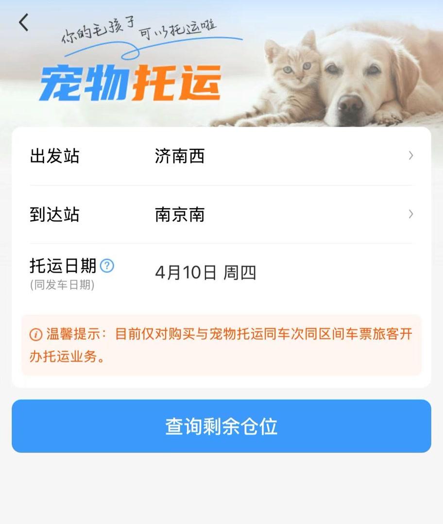 記者查詢鐵路12306App發(fā)現(xiàn),在“全部應(yīng)用”頁面“精選應(yīng)用”板塊,“寵物托運(yùn)”功能已經(jīng)上線。點(diǎn)擊“預(yù)約下單”,填寫選擇出發(fā)站、到達(dá)站以及托運(yùn)日期后,再點(diǎn)擊“查詢剩余倉位”,托運(yùn)旅客即可查詢剩余寵物倉位,并從車票訂單或本人車票中選擇已購買的車票信息進(jìn)行關(guān)聯(lián)。