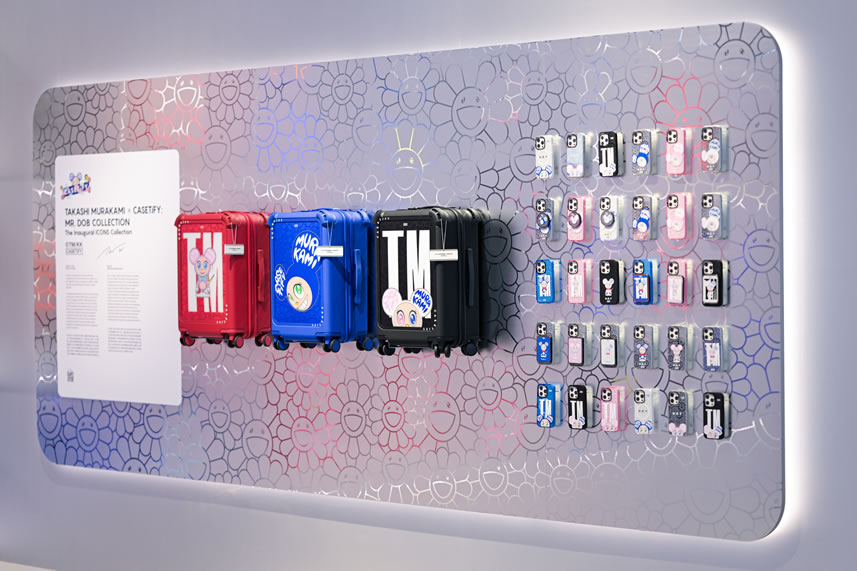 快閃空間特別設(shè)置 CASETiFY x 村上隆聯(lián)名系列展示墻,超限量發(fā)售 MR.DOB 主題聯(lián)名彈韌防摔21寸登機旅行箱,一起步入村上隆的奇妙世界。
