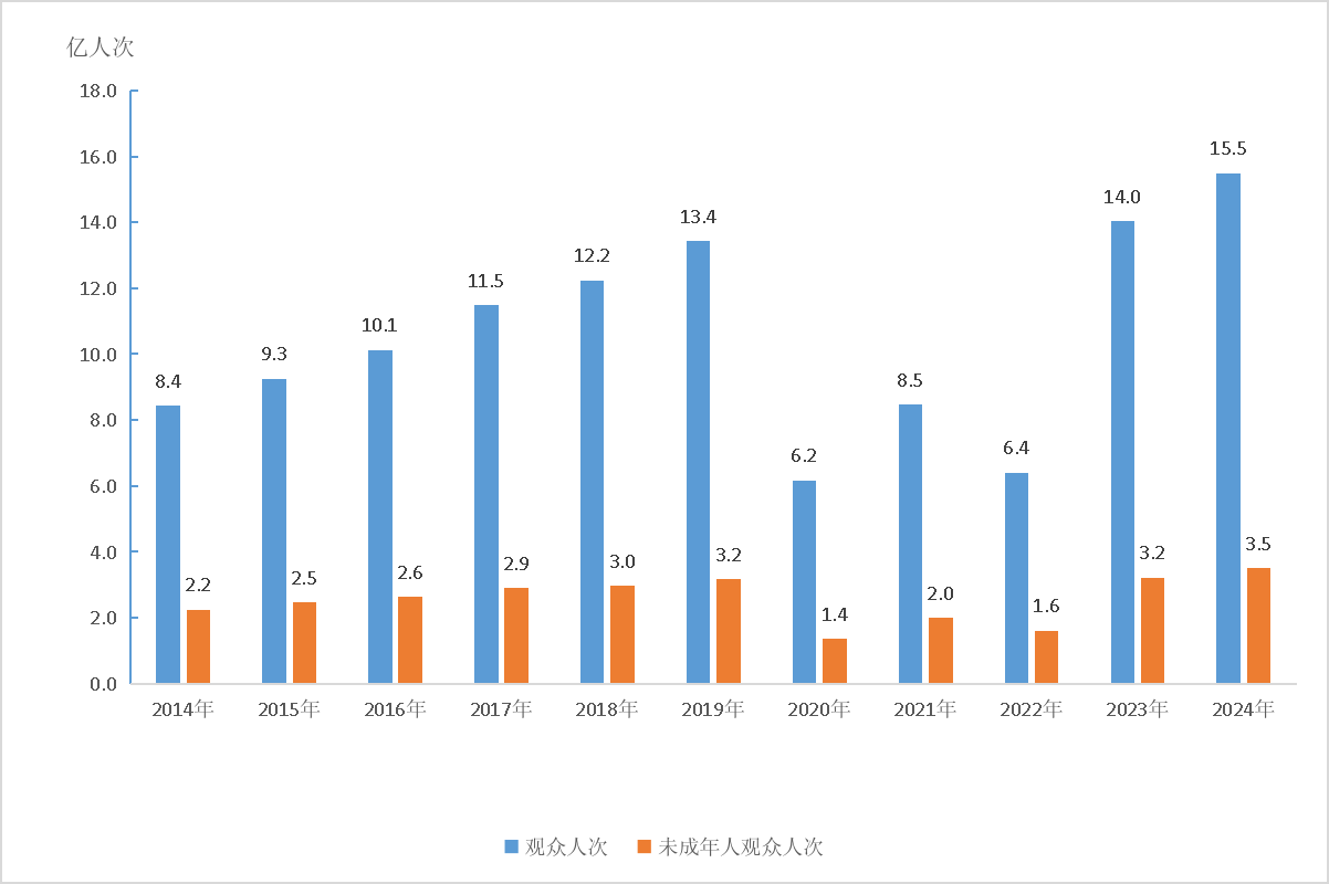 圖4:2014—2024年全國文物機(jī)構(gòu)接待觀眾人次及未成年人觀眾人次
